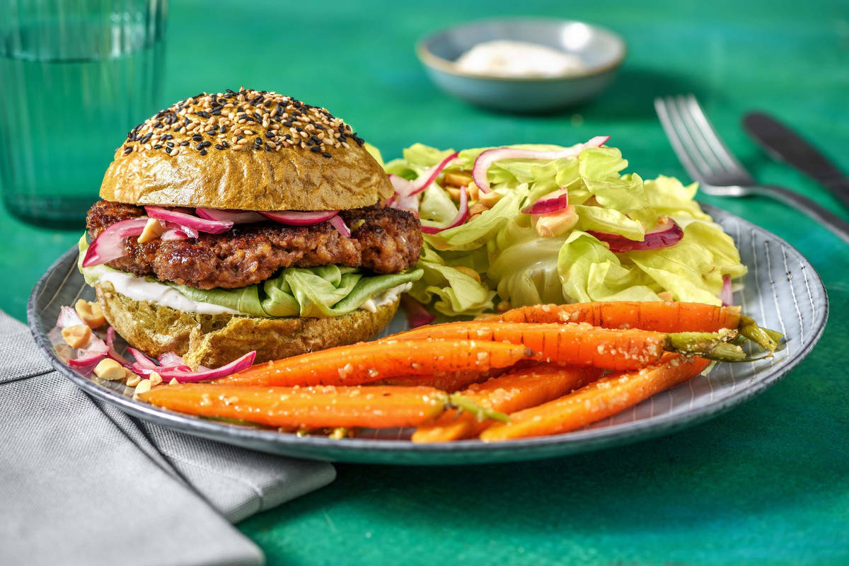 Coupez le pain aux épinards en deux et tartinez les 2 moitiés de mayonnaise au gingembre. Commencez par la laitue réservée, ajoutez le burger par-dessus et terminez par une cuillerée d’oignons rouges marinés. Saupoudrez le tout avec une partie des cacahuètes. Mélangez le reste des oignons et des cacahuètes à la salade et présentez-la en accompagnement, de même que les carottes.