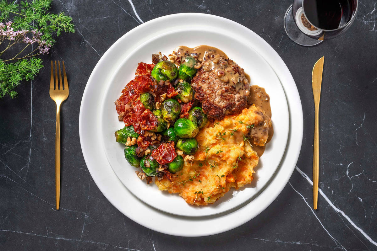 Servez la purée sur les assiettes et le burger et les choux de Bruxelles à côté. Garnissez les choux de Bruxelles des noix et la purée de pousses de moutarde. Accompagnez du jus.