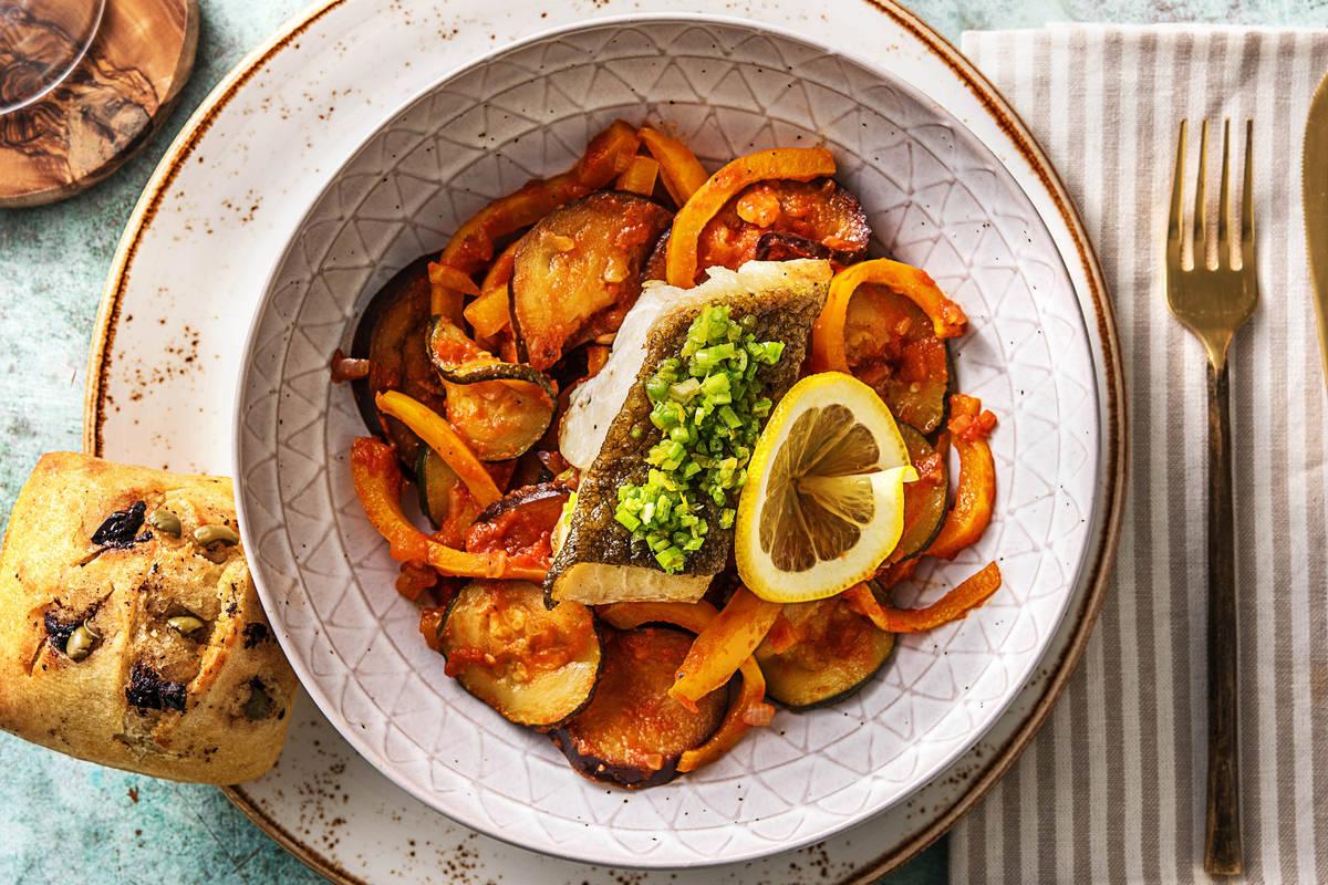 Servez le cabillaud et la ratatouille sur les assiettes. Garnissez le cabillaud avec la gremolata. Accompagnez le tout du pain aux olives et des rondelles de citron.