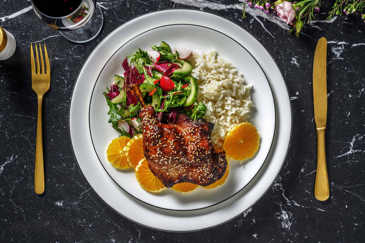 Servez la salade en présentant le riz à côté. Disposez l’orange et la cuisse de canard sur la salade.
