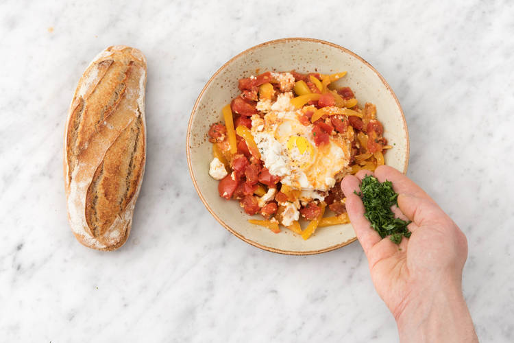 Dressez le plat sur les assiettes. Garnissez du persil restant et accompagnez de la baguette à l’épeautre, que vous pourrez tremper dans la chakchouka. Un régal !
