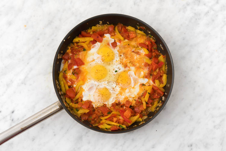 Dans le wok ou la sauteuse, faites de la place pour les œufs et ajoutez- les. Saupoudrez-les de sel et de poivre. Couvrez la poêle et laissez cuire les œufs pendant 10 minutes. À mi-cuisson environ, ajoutez le fromage de chèvre en morceaux sur l’ensemble et enlevez le couvercle de la poêle pendant les 4 dernières minutes. Augmentez légèrement la cuisson et laissez l’humidité excessive s’évaporer.