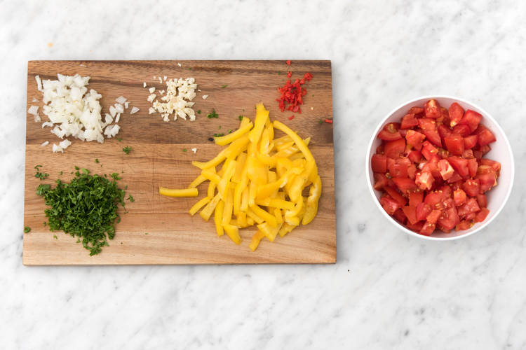 Préchauffez le four à 210 degrés. Émincez l’oignon et pressez ou hachez l’ail finement. Ôtez les graines du piment et émincez-le finement. Émincez également le poivron et le persil et coupez la tomate en morceaux.