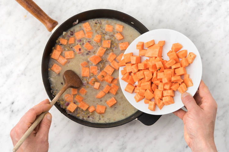 Entre-temps, épluchez la patate douce et coupez-la en morceaux de 1 cm. Après 10 minutes, ajoutez-la au wok ou à la sauteuse et laissez cuire pendant 15 minutes.