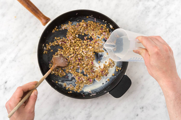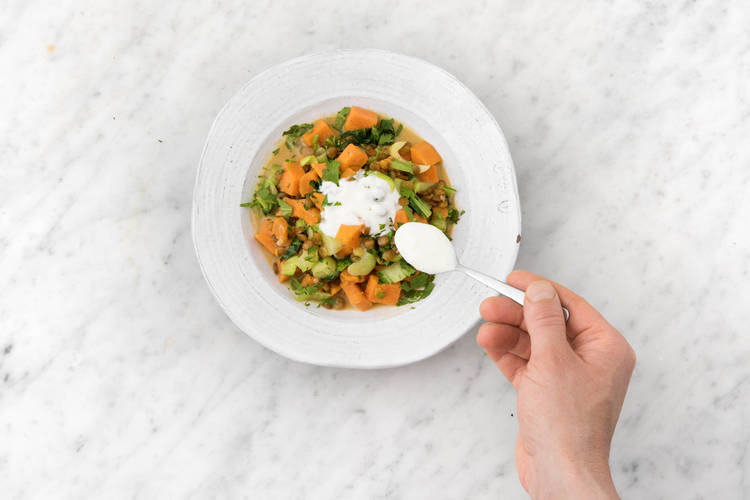 Faites chauffer l’huile de tournesol dans un wok ou une sauteuse avec couvercle et faites cuire l’ail, le piment rouge, les lentilles et les épices pour curry à feu moyen pendant 1 minute en remuant. Ajoutez le lait de coco et 150 ml d’eau par personne. À couvert, portez à ébullition et laissez mijoter à feu doux pendant 30 minutes.