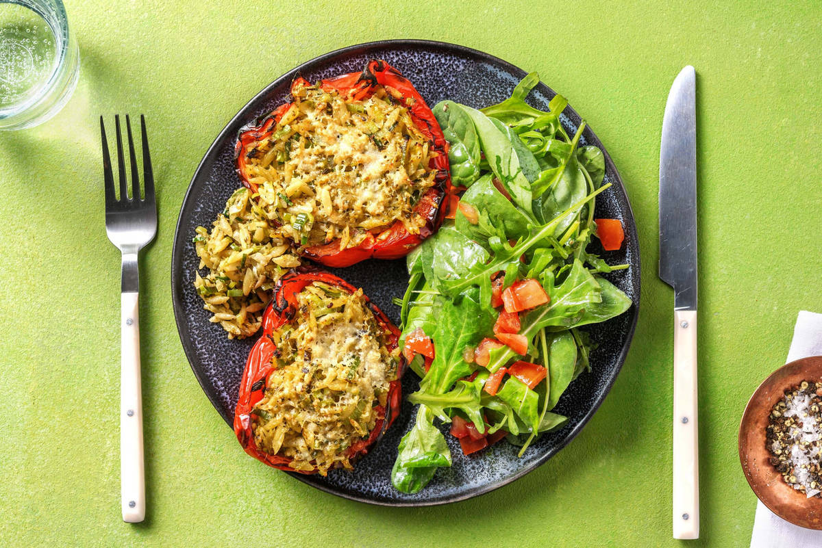 Servez les poivrons farcis sur les assiettes et accompagnez-les de la salade.
