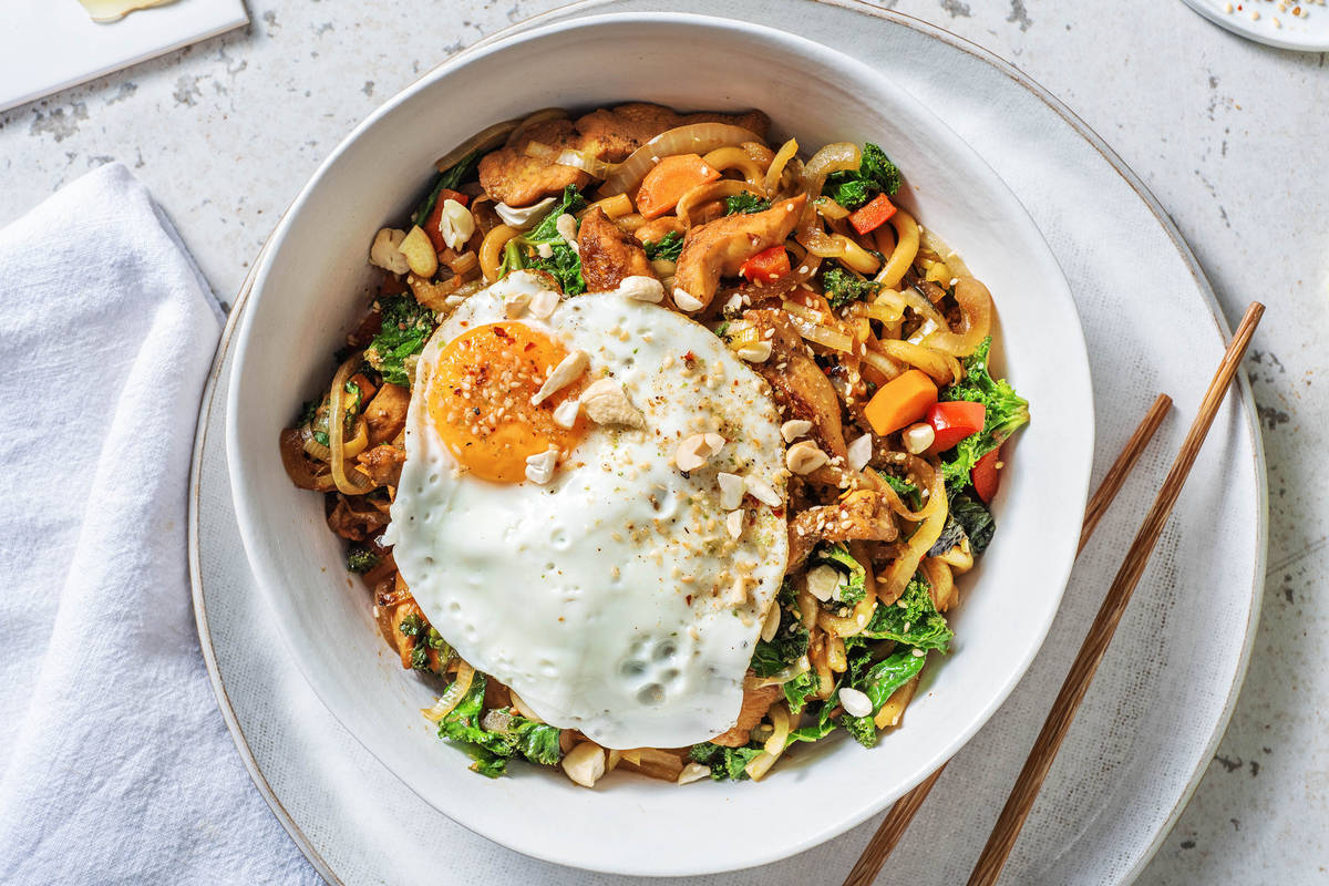 Répartissez les nouilles avec les légumes et le poulet sur les assiettes. Disposez l'œuf au plat dessus. Garnissez de noix de cajou et de gomasio.