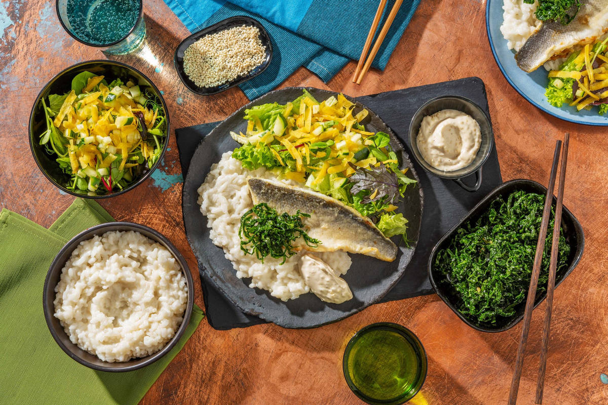 Servez le riz sur les assiettes. Disposez la salade autour et disposez le filet de bar sur le riz. Présentez la salade d'algues sur le poisson. Garnissez le plat avec la vinaigrette au sésame.