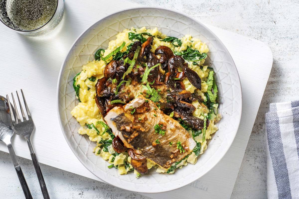 Servez le reste des épinards sur les assiettes et la purée de pommes de terre-épinards par-dessus. Disposez-y le filet de merlu et les champignons. Garnissez du persil frisé. Si vous le souhaitez, versez le jus du plat à four sur la purée.