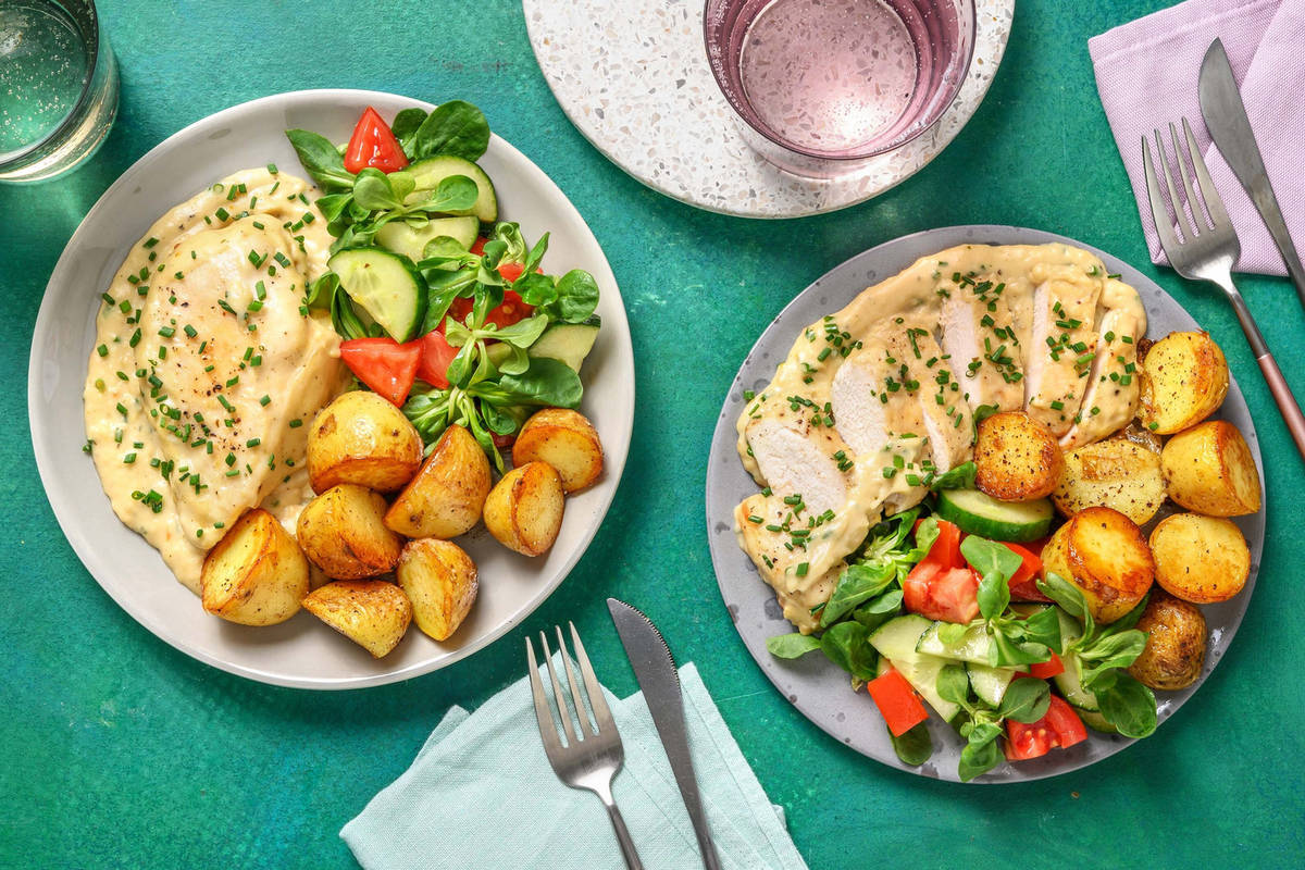 Ajoutez le concombre, les tomates et la mâche à la vinaigrette, puis mélangez. Servez les grenailles sur les assiettes et accompagnez-les du filet de poulet dans sa sauce à la ciboulette et de la salade.