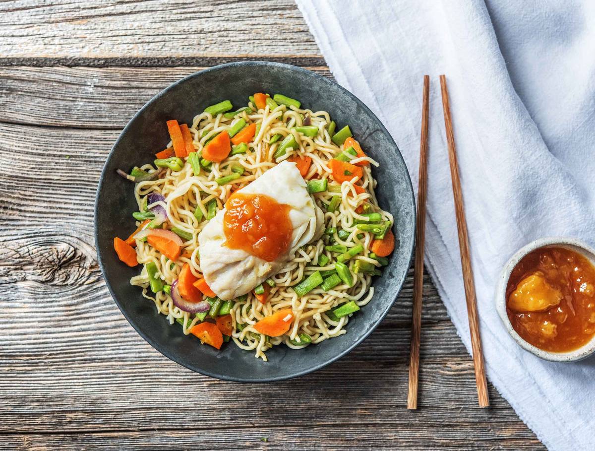 Servez les nouilles aux légumes sur les assiettes. Accompagnez du filet d’églefin et du reste de chutney de mangue.