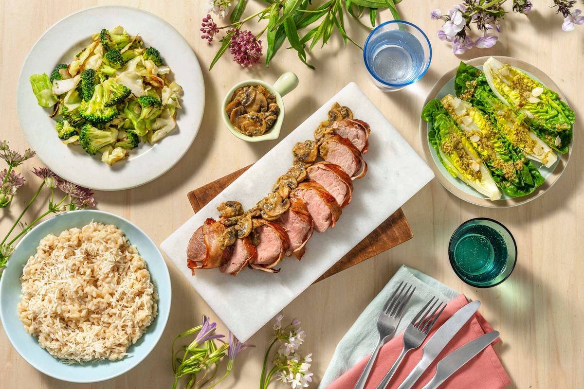 Découpez le filet mignon de porc au lard en tranches et servez-le avec la sauce crémeuse aux champignons. Servez le risotto dans dans un plat et saupoudrez-le du reste de pecorino. Accompagnez le tout du chou pointu & brocoli sautés ainsi que de la little gem.