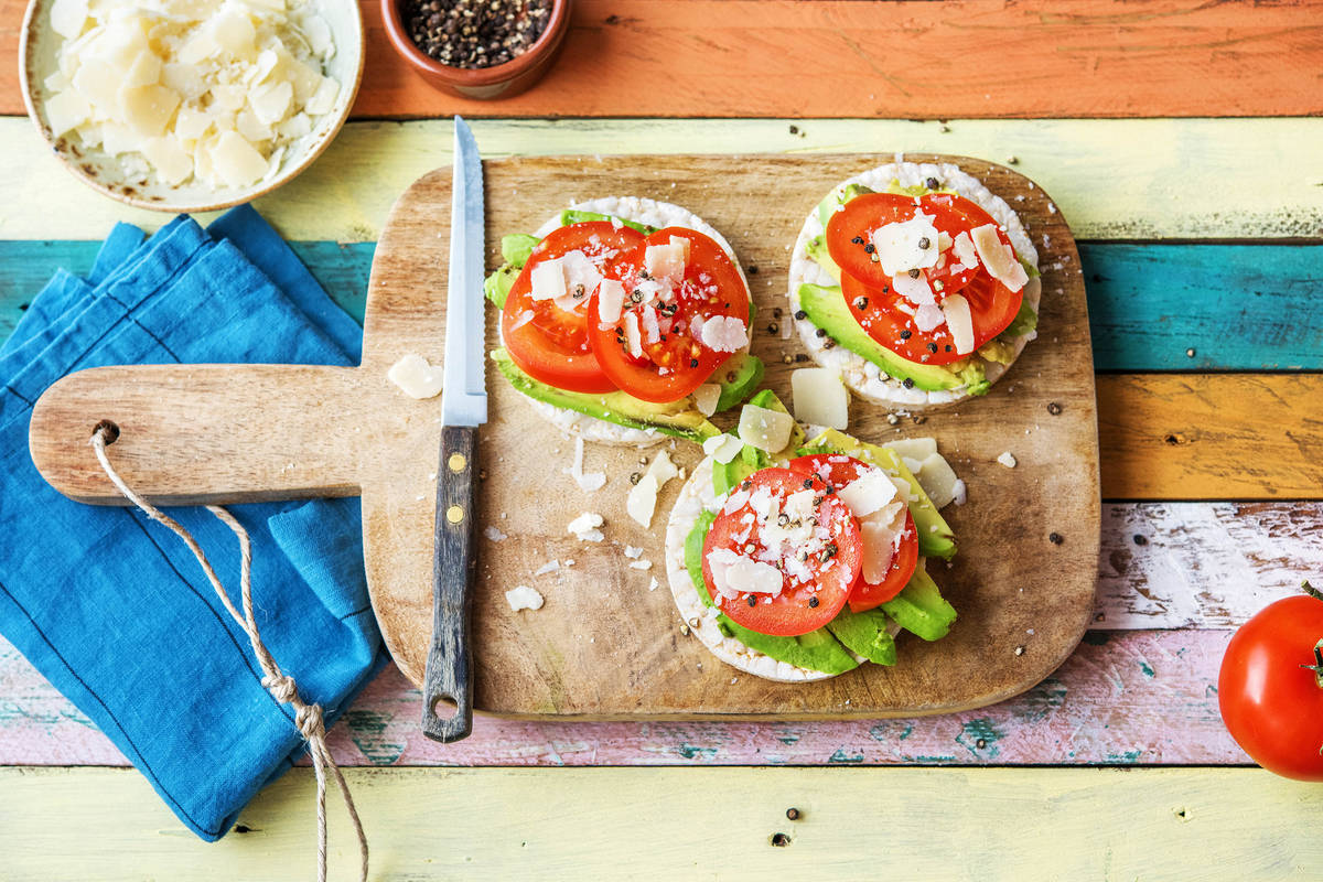 Tartinez-le ensuite sur les gaufres d’épeautre. Taillez la tomate prune en tranches et disposez-les sur l’avocat.