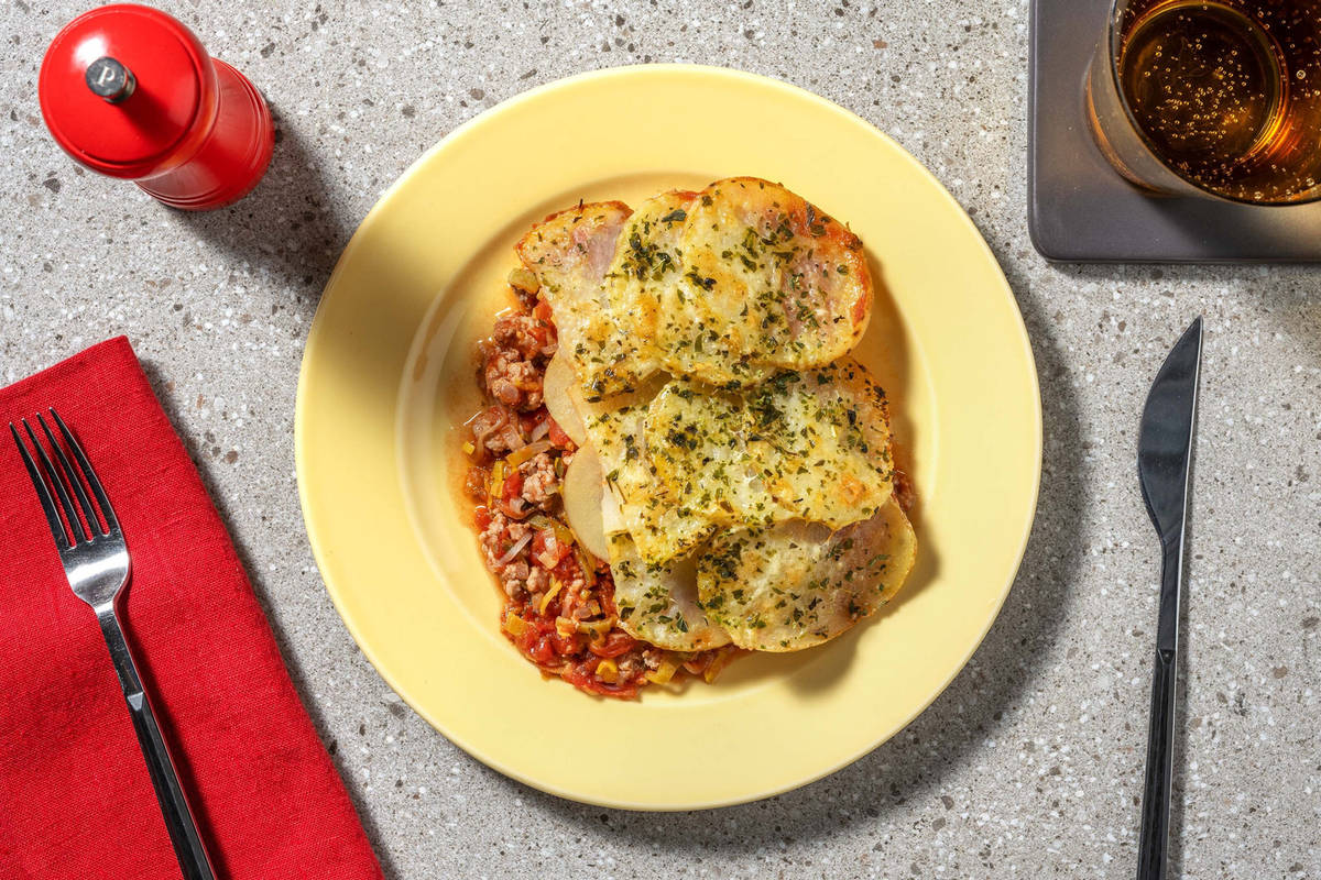 Mettez le mélange dans le plat à four et disposez-y les tranches de pommes de terre par-dessus en les chevauchant. Saupoudrez du fromage râpé et d'origan séché, puis enfournez 8 à10 minutes, ou jusqu’à ce que le fromage ait fondu. Sortez le plat du four et laissez reposer 2 à 3 minutes. Servez le plat sur les assiettes.