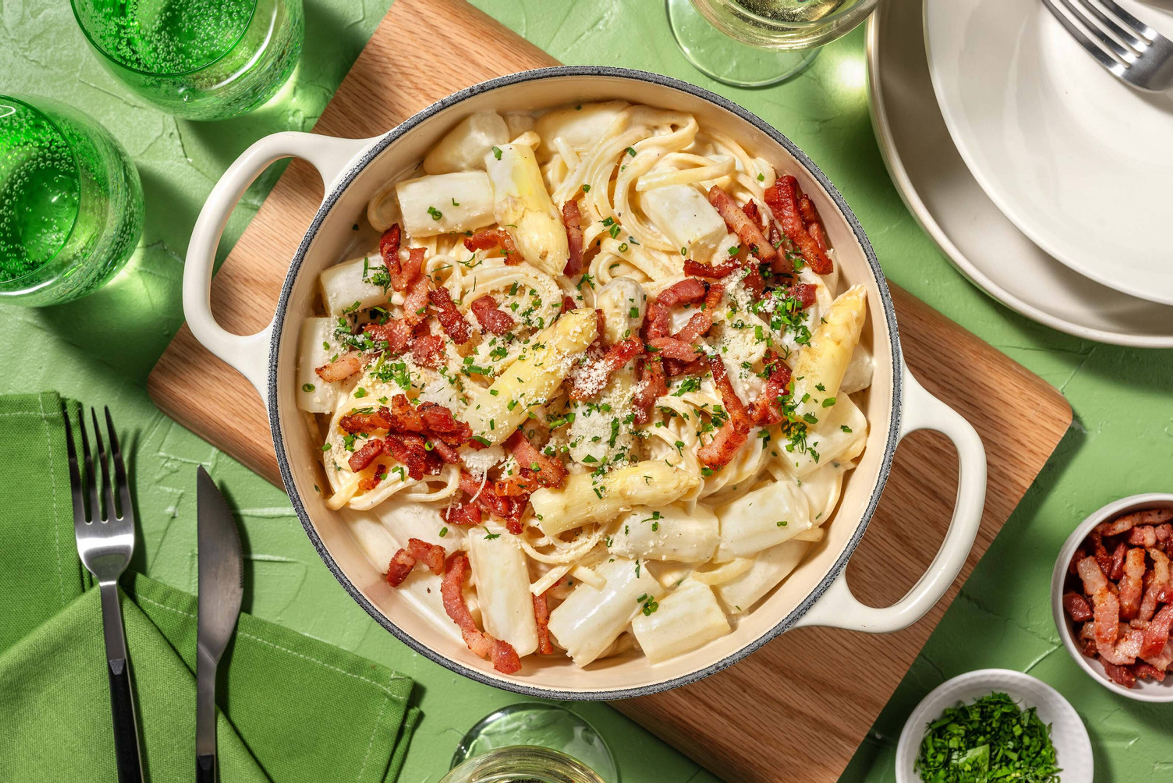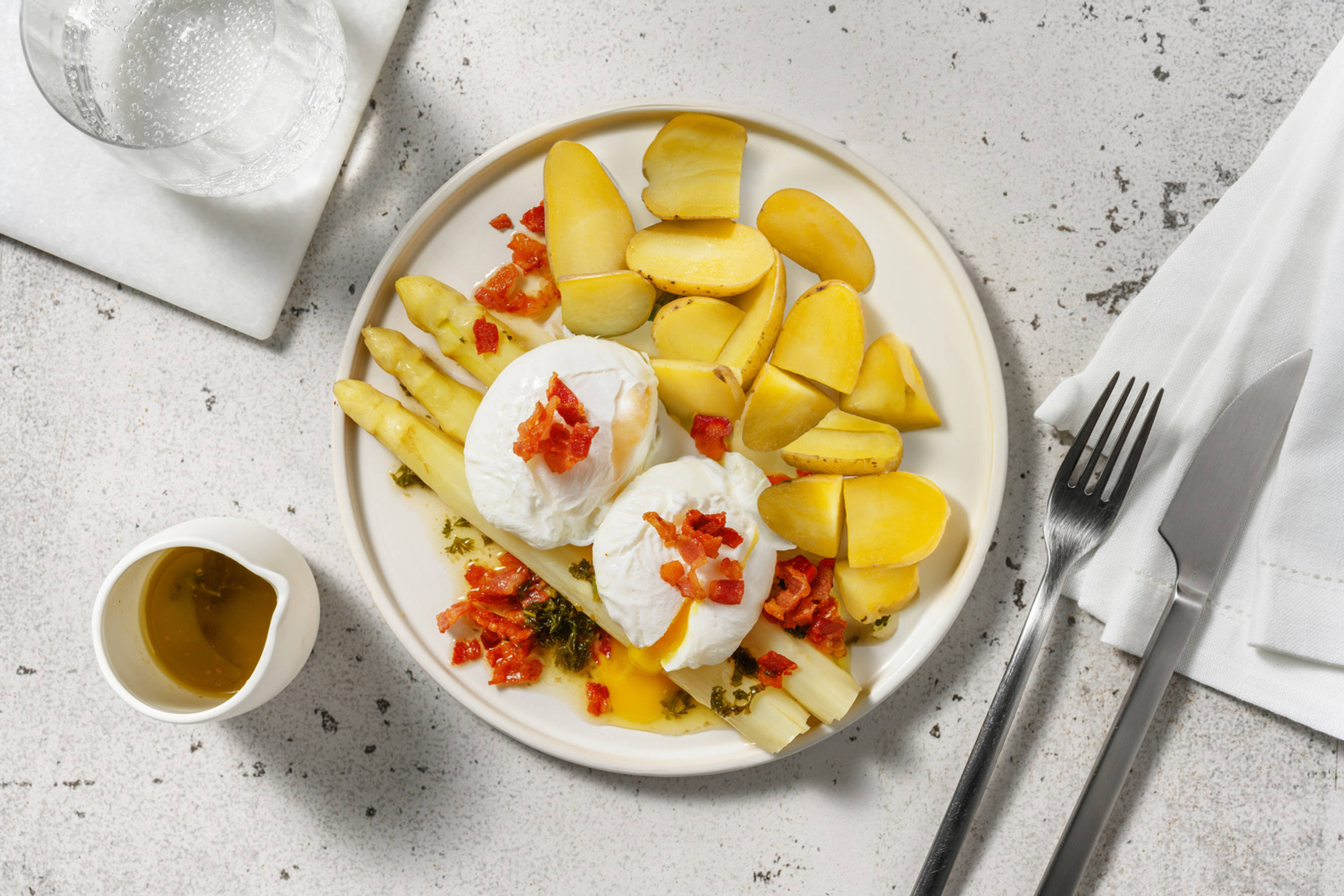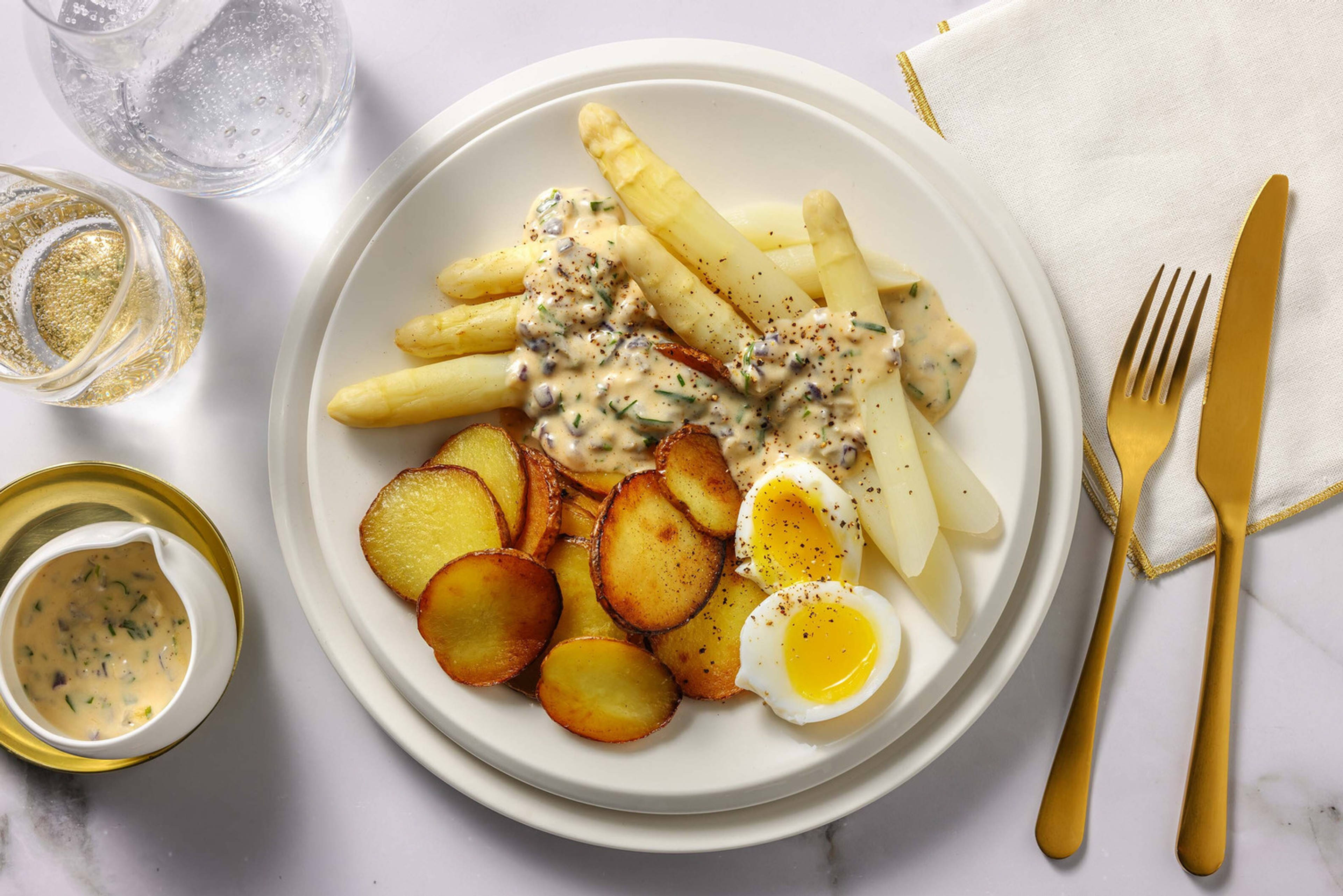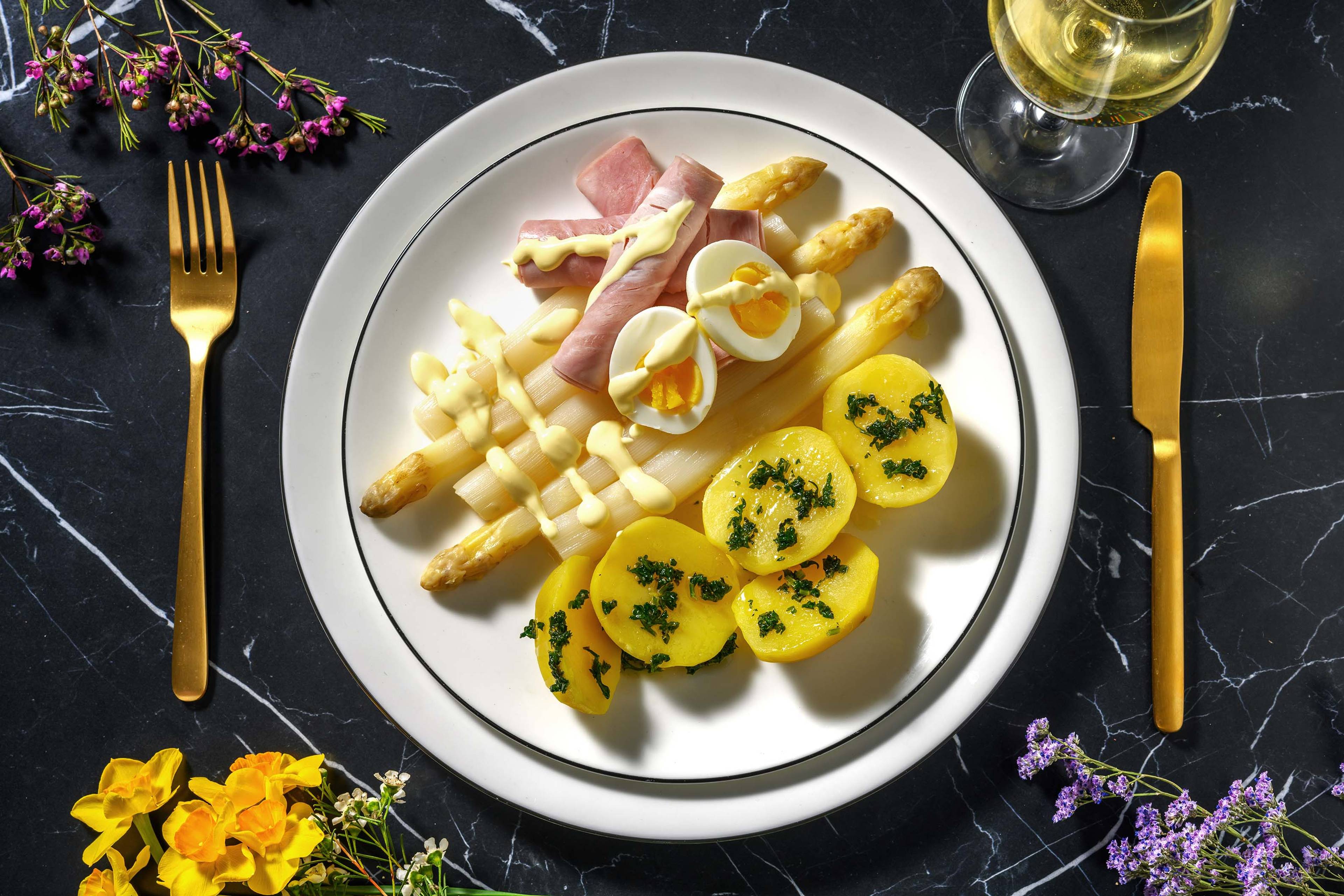 INGRÉDIENTS : asperges blanches. CONSERVATION ET PRÉPARATION : À conserver au frais (max. 7°C). ORIGINE : Pays-Bas. HelloFresh Antwoordnummer 39162 1090 WC Amsterdam Pays-Bas HelloFresh met tout en œuvre pour communiquer les informations les plus exactes possibles sur ses produits mais ne peut cependant garantir l'exactitude, le caractère complet et/ou actuel de ces informations. Nos recettes sont régulièrement revues et améliorées, ce qui signifie que les informations concernant les allergènes (telle que la mention ""peut contenir de""), la valeur nutritionnelle, les ingrédients ou tout autre détails sur nos produits peuvent être amenées à changer et que des différences peuvent apparaître entre les informations indiquées sur le Site Internet et/ou l'Application et celles présentes sur le produit. En cas de doute, toujours se référer aux informations présentent sur l'étiquette. Pour toute question sur nos produits, merci de contacter le service clients. Si vous avez des questions sur des produits qui ne sont pas vendus sous la marque HelloFresh vous pouvez également contacter directement le fabricant des ces produits si vous le souhaitez.