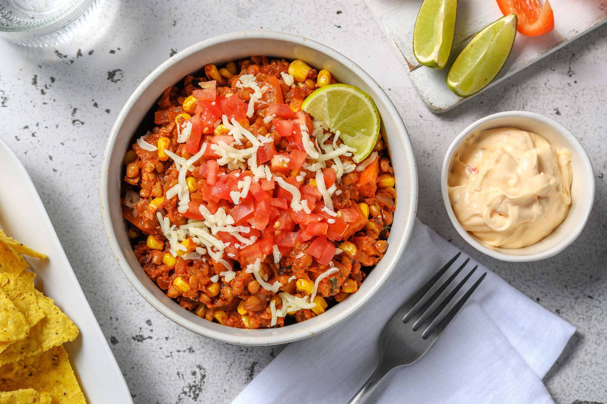 Servez le mijoté de lentilles dans des assiettes creuses. Garnissez du cheddar râpé, de la sauce à la tomate et des quartiers de citron vert. Accompagnez de la sauce douce pimentée et des chips de tortillas.