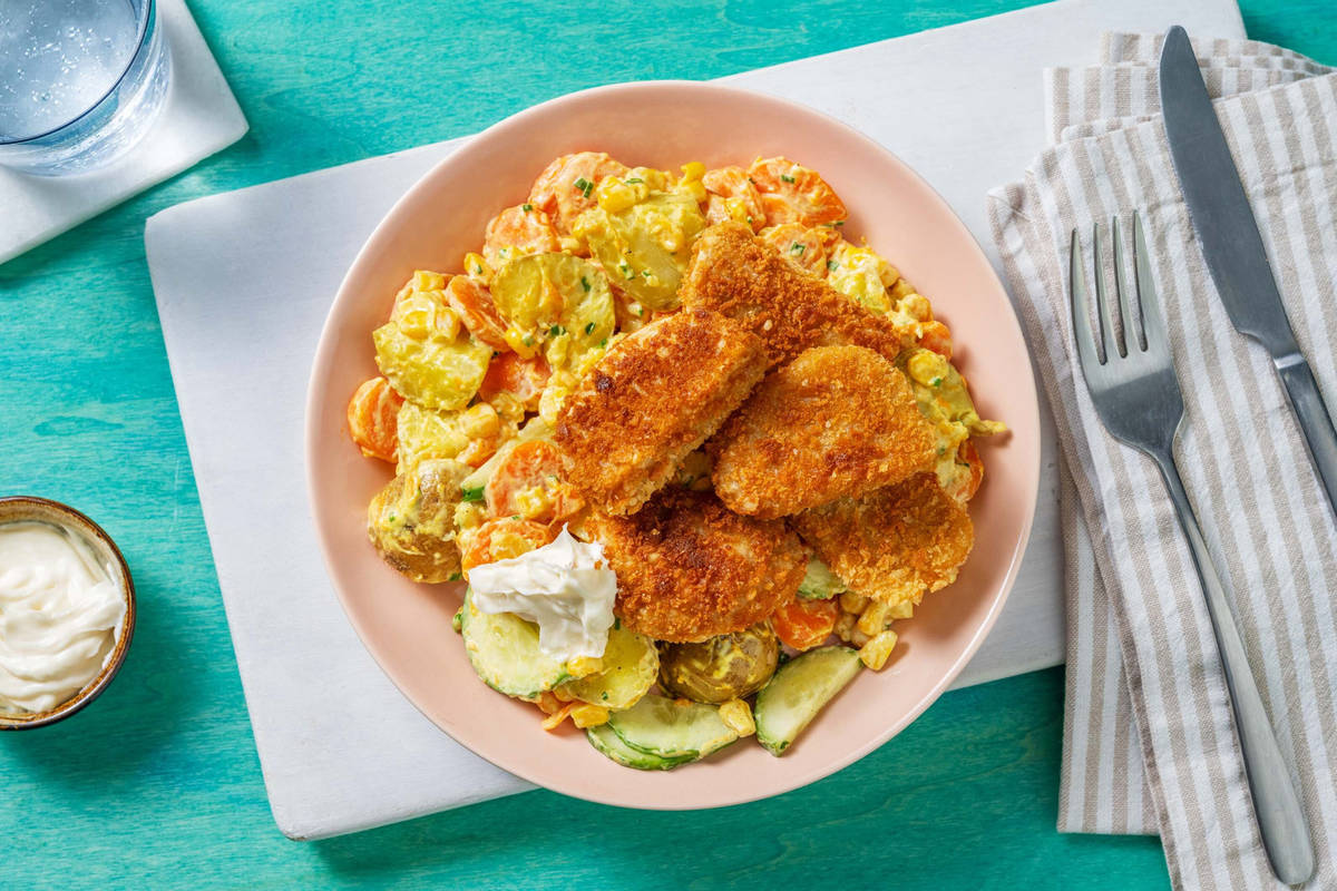 Servez la salade de grenailles et les nuggets végétariens sur les assiettes. Accompagnez du reste de la mayonnaise.
