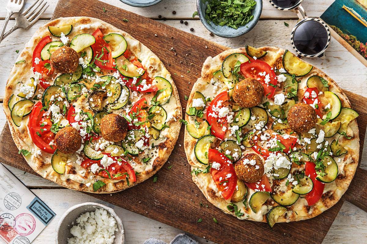 Tartinez la sauce au yaourt et au houmous sur les pains plats. Disposez les tranches de tomate et de courgette dessus, terminez par les falafels. Garnissez avec la feta et la menthe, puis salez et poivrez.