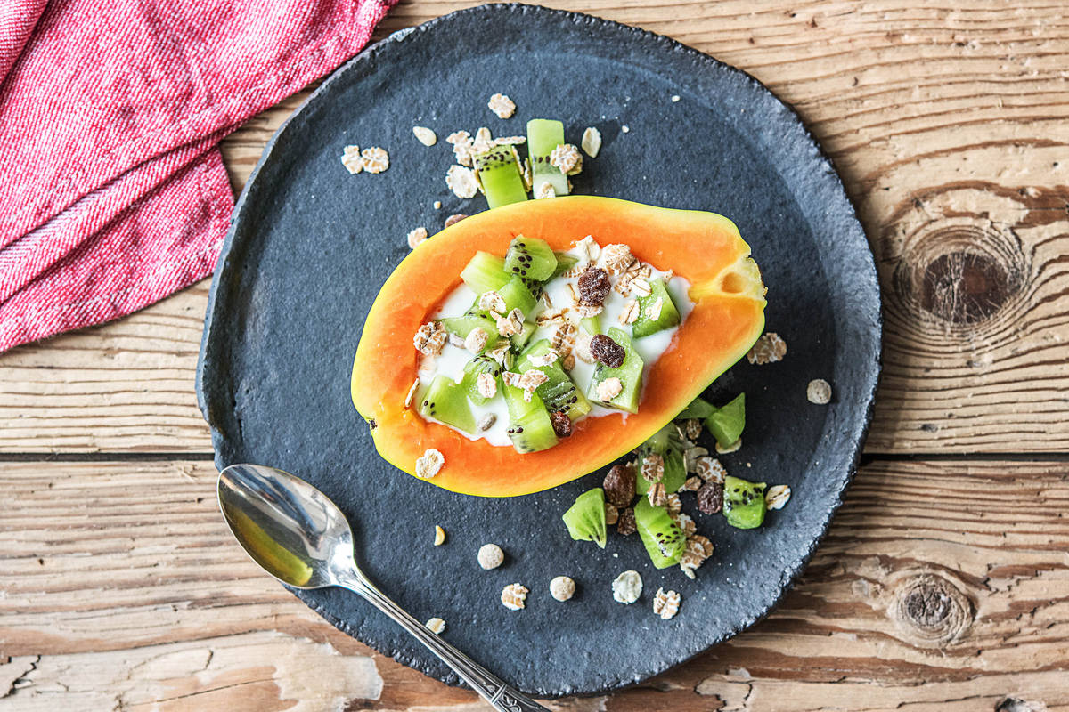 Disposez une moitié de papaye sur chaque assiette.