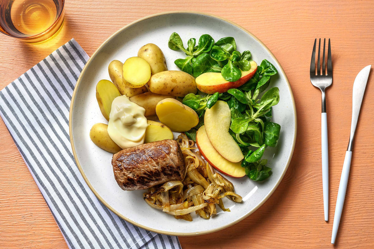 Dans le saladier, préparez la vinaigrette avec, par personne : 1 cc de moutarde, 1 cc de vinaigre balsamique blanc, 1/2 cs d'huile d'olive vierge extra ainsi que du sel et du poivre. Coupez la pomme en morceaux et mélangez-la avec la mâche à la vinaigrette. Servez les grenailles, les paupiettes et l'endive sur les assiettes. Accompagnez de la salade et de la mayonnaise.