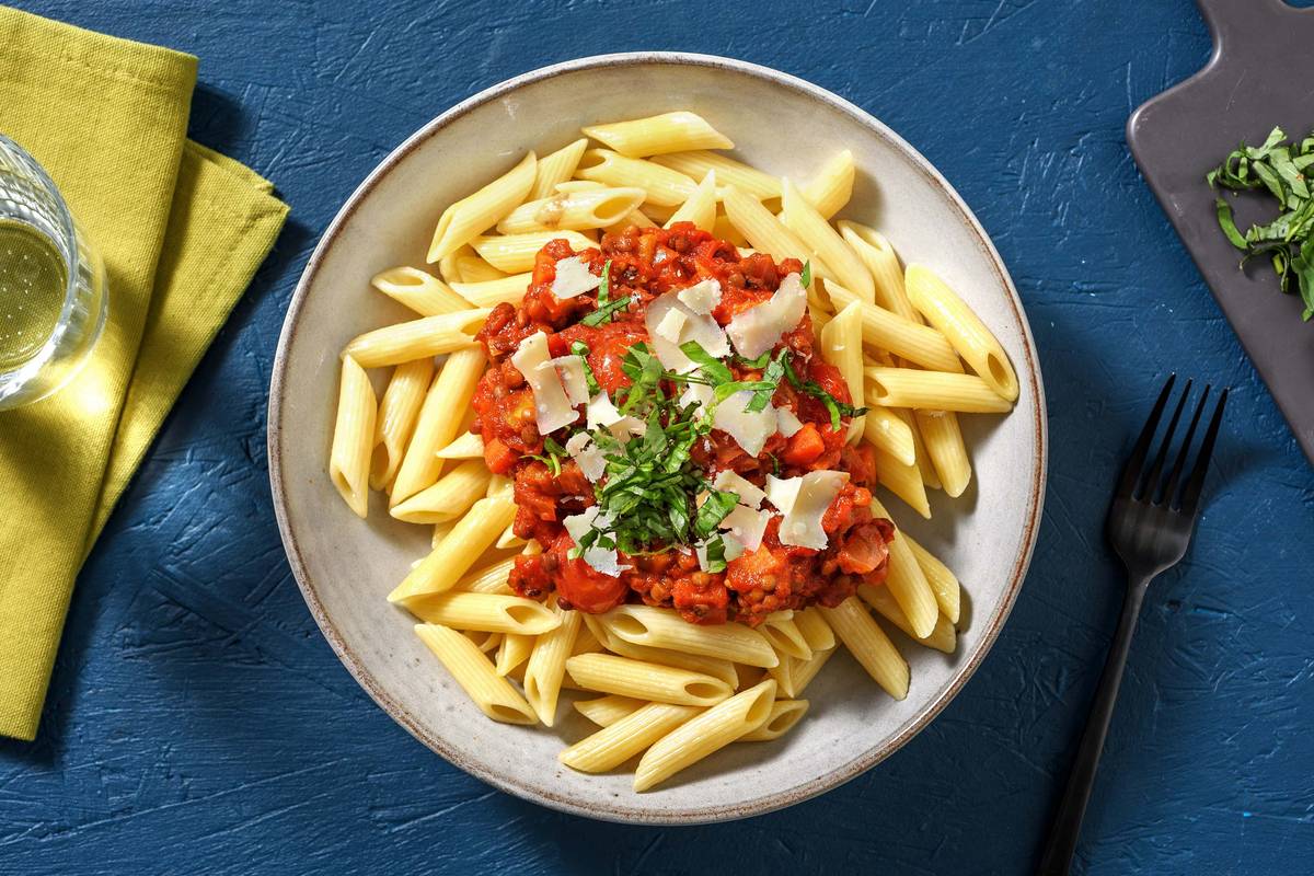 Servez les penne sur les assiettes et versez la sauce bolognaise végétarienne par-dessus. Garnissez du basilic et du grana padano.