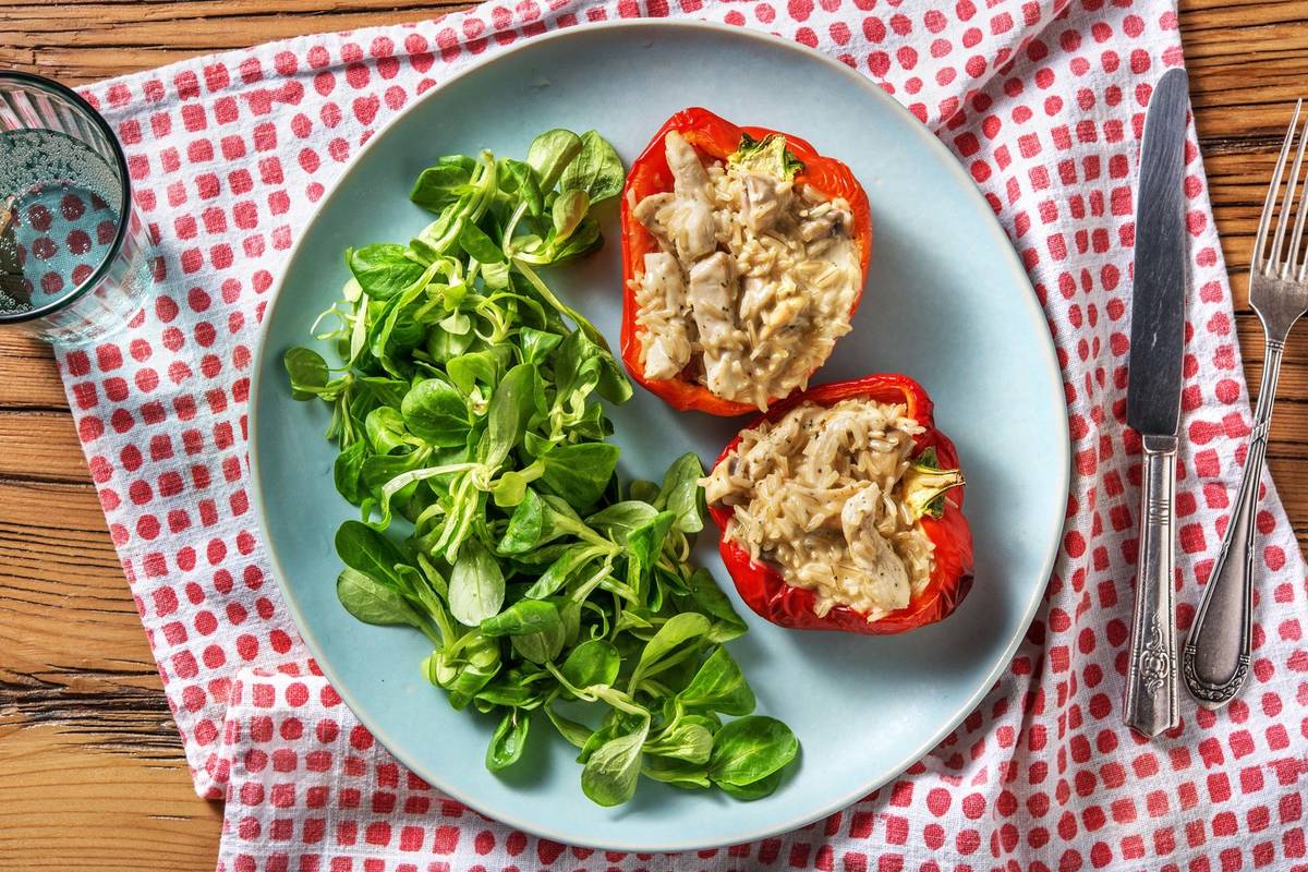 Servez les poivrons sur les assiettes et accompagnez-les de la salade.