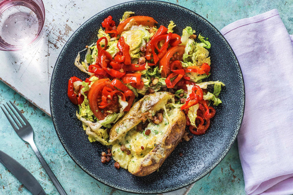 Servez une pomme de terre farcie par assiette. Garnissez-la des lardons et accompagnez-la des poivrons pointus marinés et de la salade.