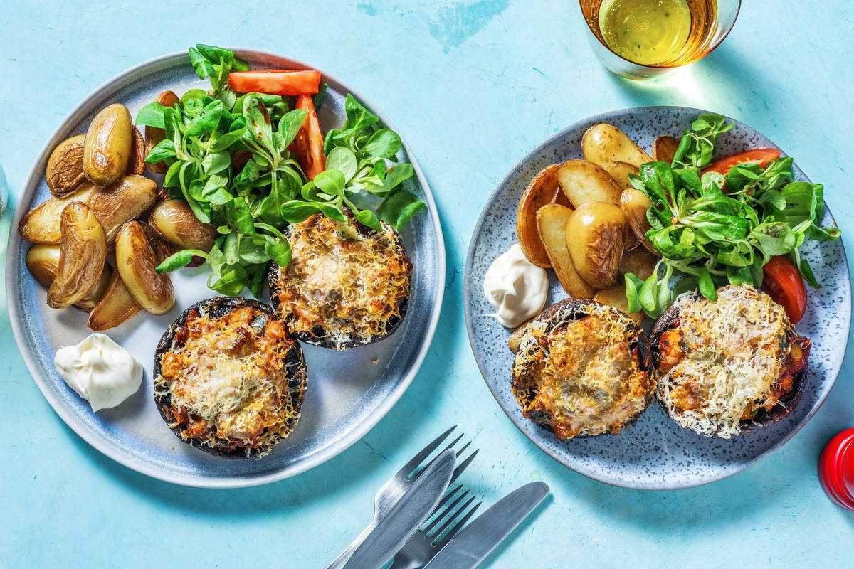 Présentez 2 portobellos farcis par personne sur les assiettes et les grenailles à côté. Servez la salade sur les assiettes. Accompagnez les grenailles de mayonnaise.