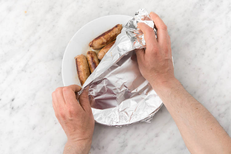 Remettez la poêle sur feu moyen et faites revenir les 2 oignons dans la graisse des saucisses. Ajoutez les pommes de terre, le thym et le cumin et sautez pendant une minute à feu vif. Ajoutez le bouillon et laissez mijoter à couvert pendant 15 à 20 minutes.