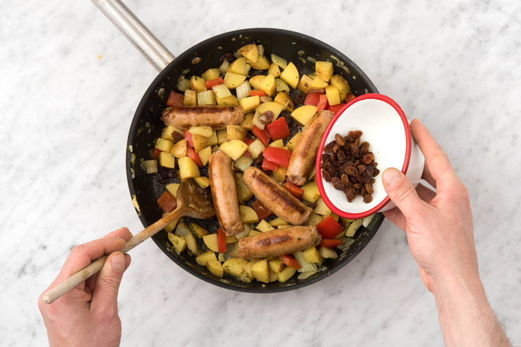 Après 5 minutes, ajoutez le fenouil et le poivron au wok, puis, après 5 autres minutes, les saucisses d’agneau et les raisins secs. Enlevez le couvercle et réglez la cuisson sur feu moyen. Assaisonnez selon votre goût.