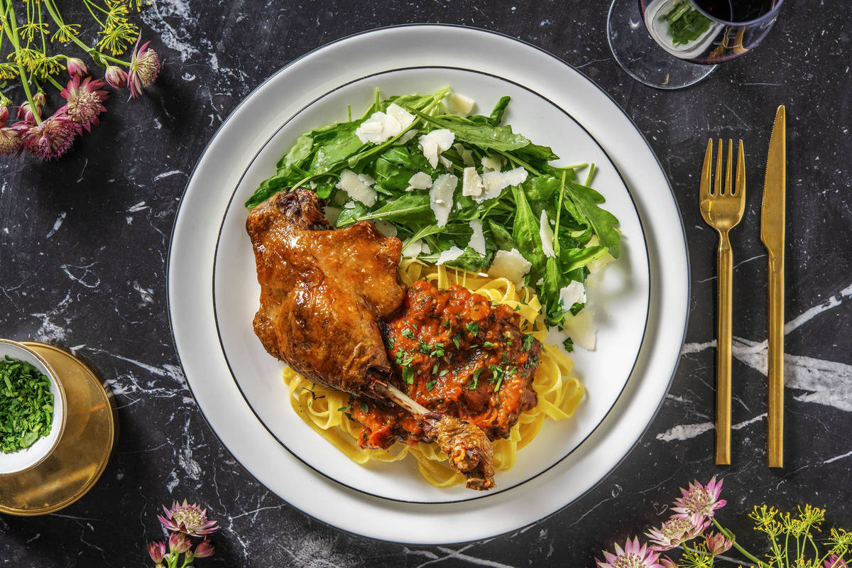 Servez les pâtes dans des assiettes creuses et versez la sauce tomate au canard par-dessus. Saupoudrez le tout du persil et de copeaux de fromage vieux et servez avec la salade de roquette.
