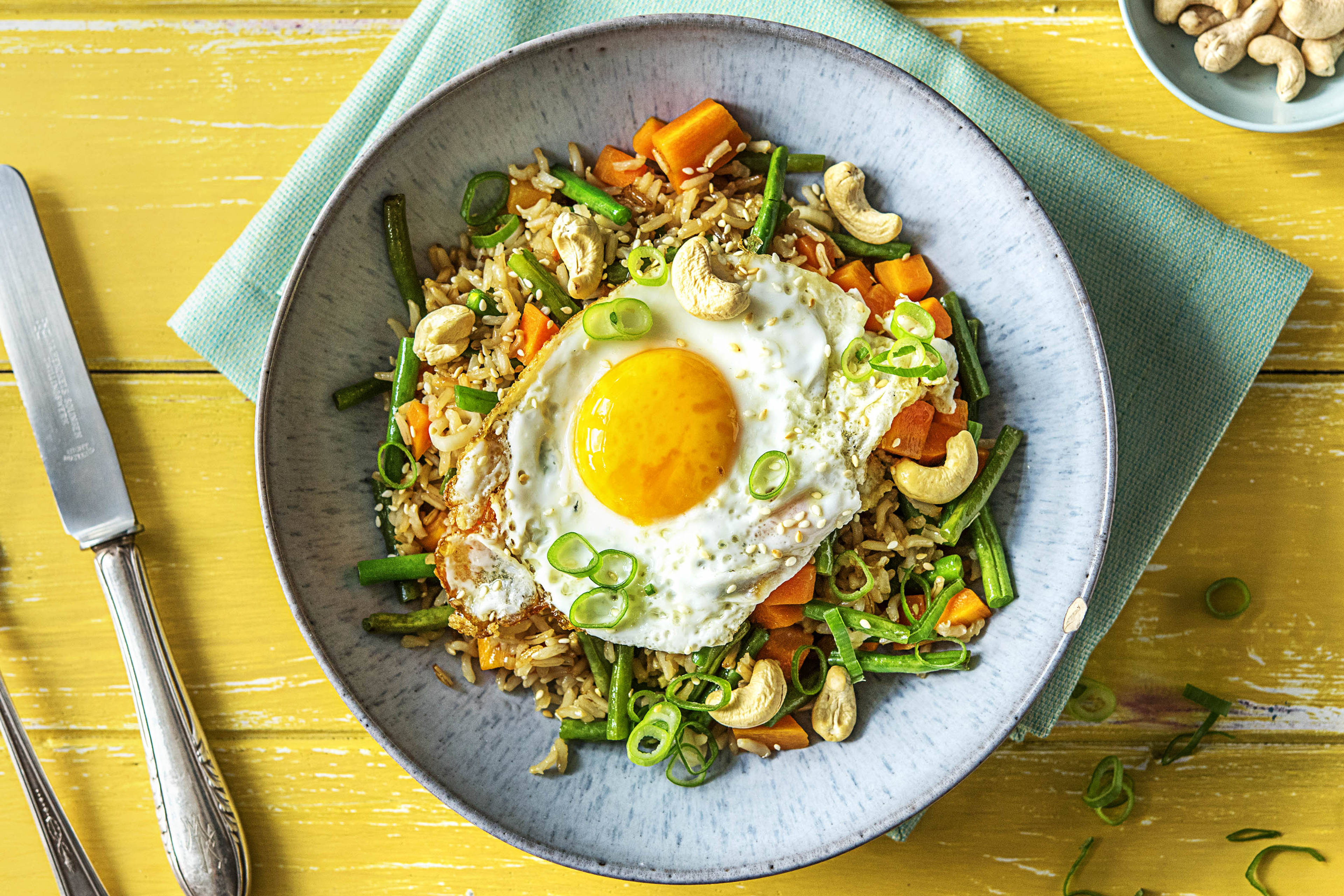 Riz aux légumes croustillants avec graines de sésame et cacahuètes