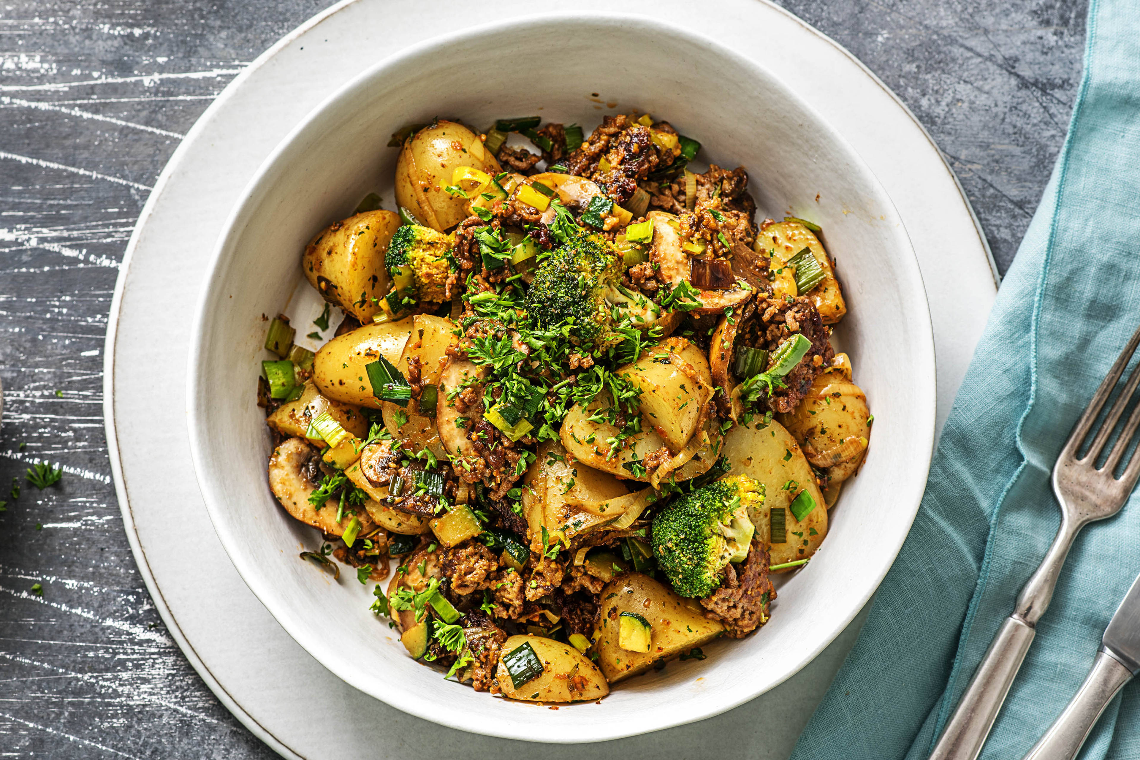 servi avec du poireau, des champignons et pommes de terre au curry terre au curie