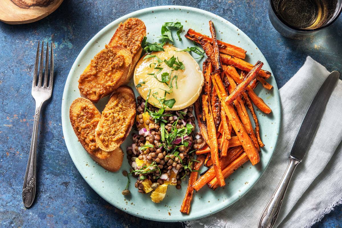 Servez la salade de lentilles sur les assiettes avec une tranche de fromage de chèvre par- dessus. Accompagnez des frites de carotte et de l'oignon. Présentez les bruschettas en accompagnement. Garnissez du reste de persil.