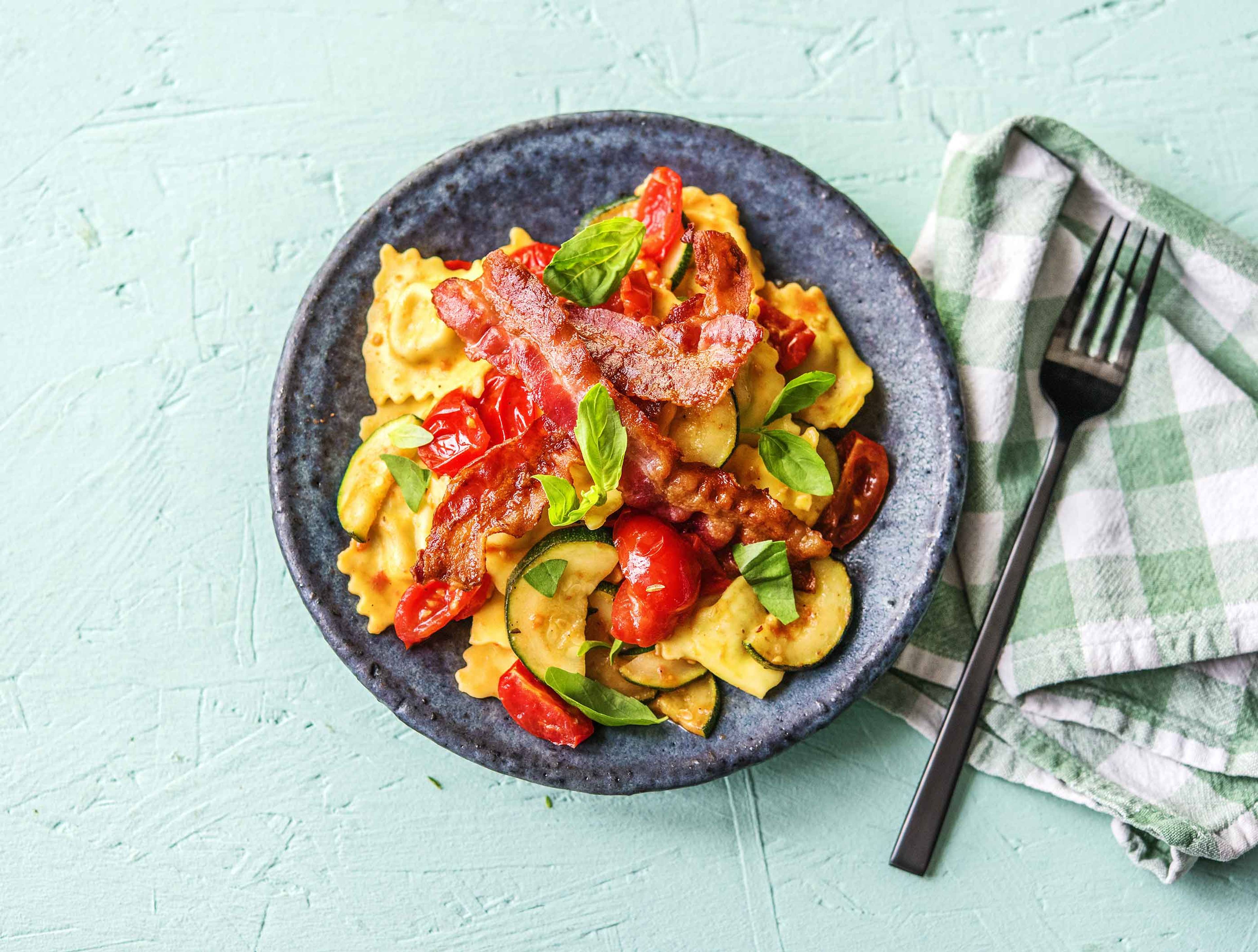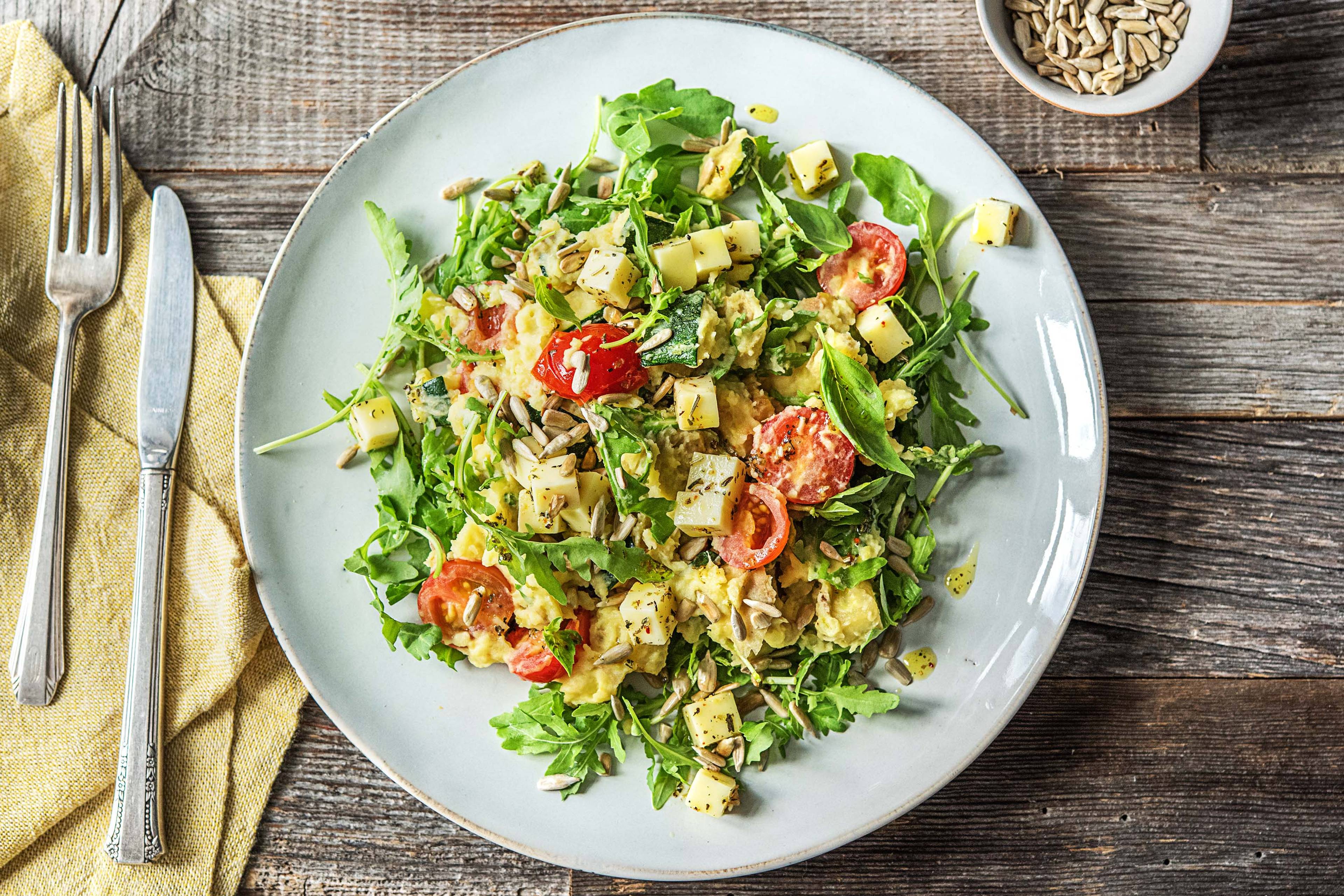 Coupez la chicorée frisée en lanières. Coupez les tomates cerises en deux. Ciselez grossièrement les feuilles de basilic. Râpez grossièrement le parmigiano reggiano. Mélangez la chicorée frisée, les tomates cerises, la moitié du basilic et les croûtons dans le saladier.