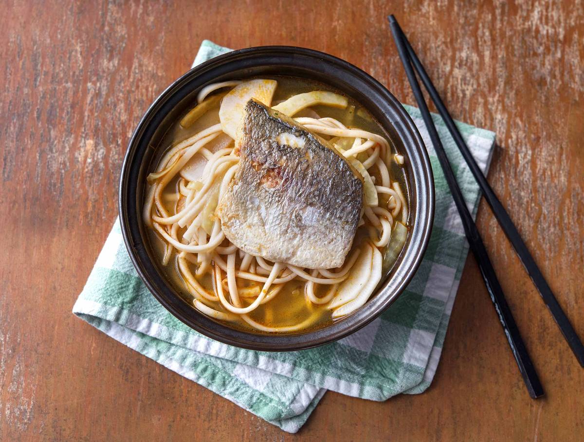 Servez la soupe dans les bols et disposez le poisson par-dessus.
