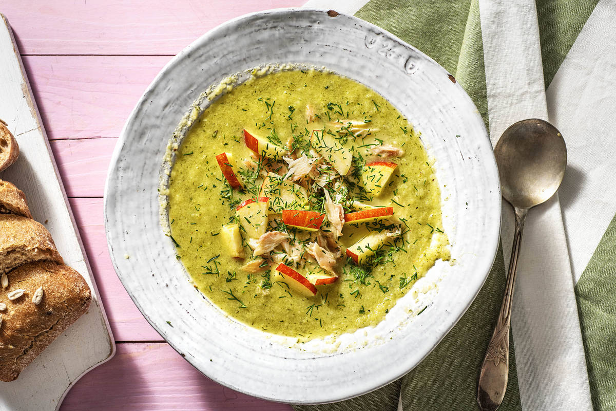 Servez la soupe sur des assiettes creuses ou dans des bols. Disposez la truite fumée et la pomme au milieu, puis garnissez avec l’aneth et du poivre (fraîchement moulu). Accompagnez le tout de la ciabatta aux graines de tournesol.