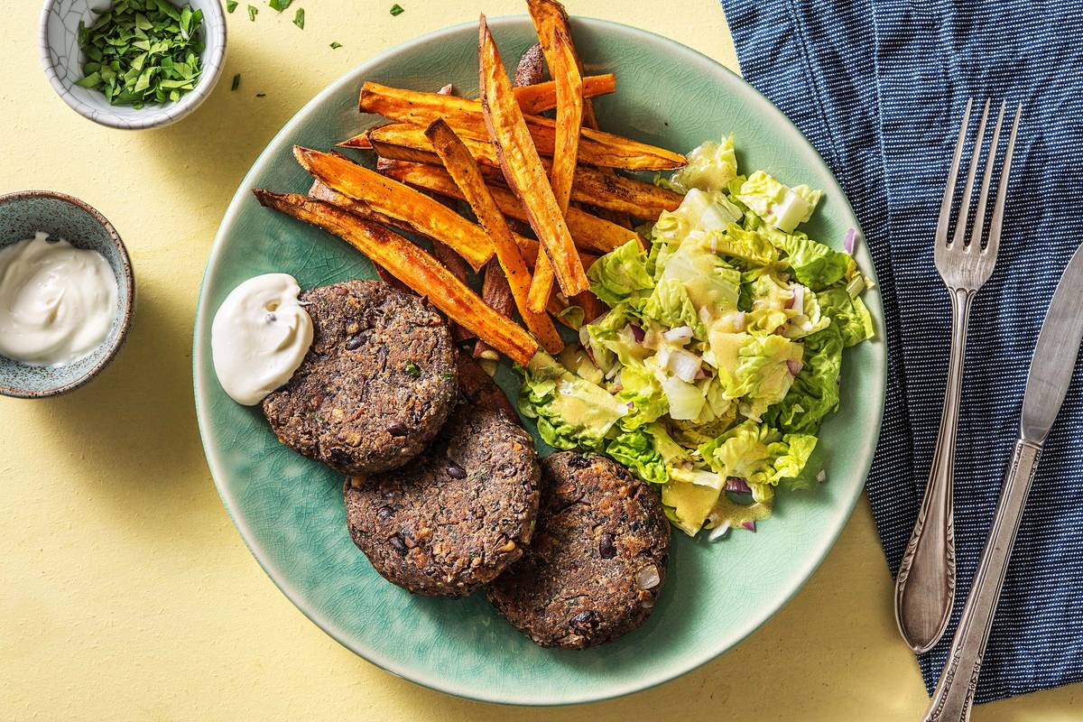 Servez les frites de patate douce et disposez les steaks à côté. Accompagnez-les de la salade et de la mayonnaise.