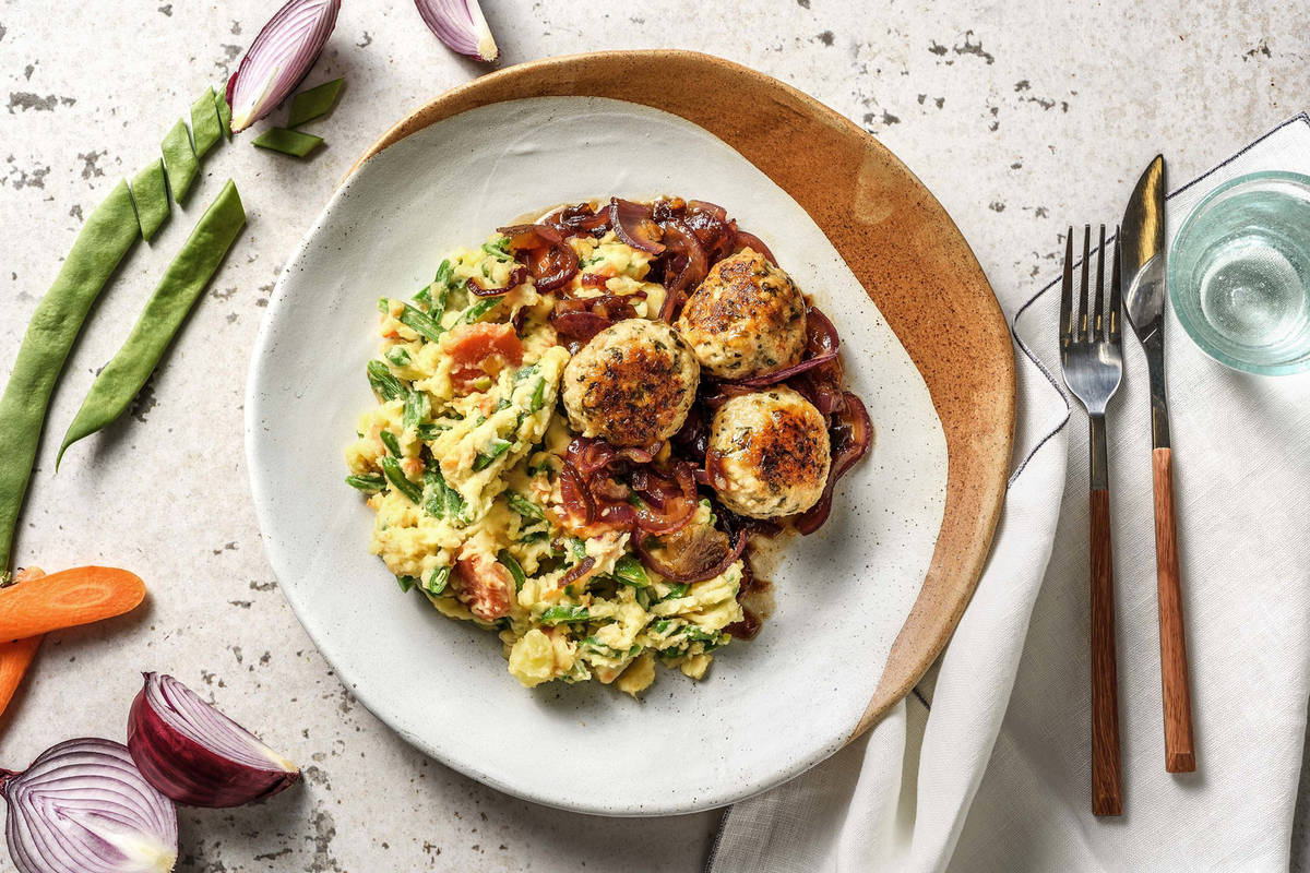 Servez le stoemp sur les assiettes. Disposez les boulettes de poulet haché par-dessus et versez le jus à l'oignon sur le tout.