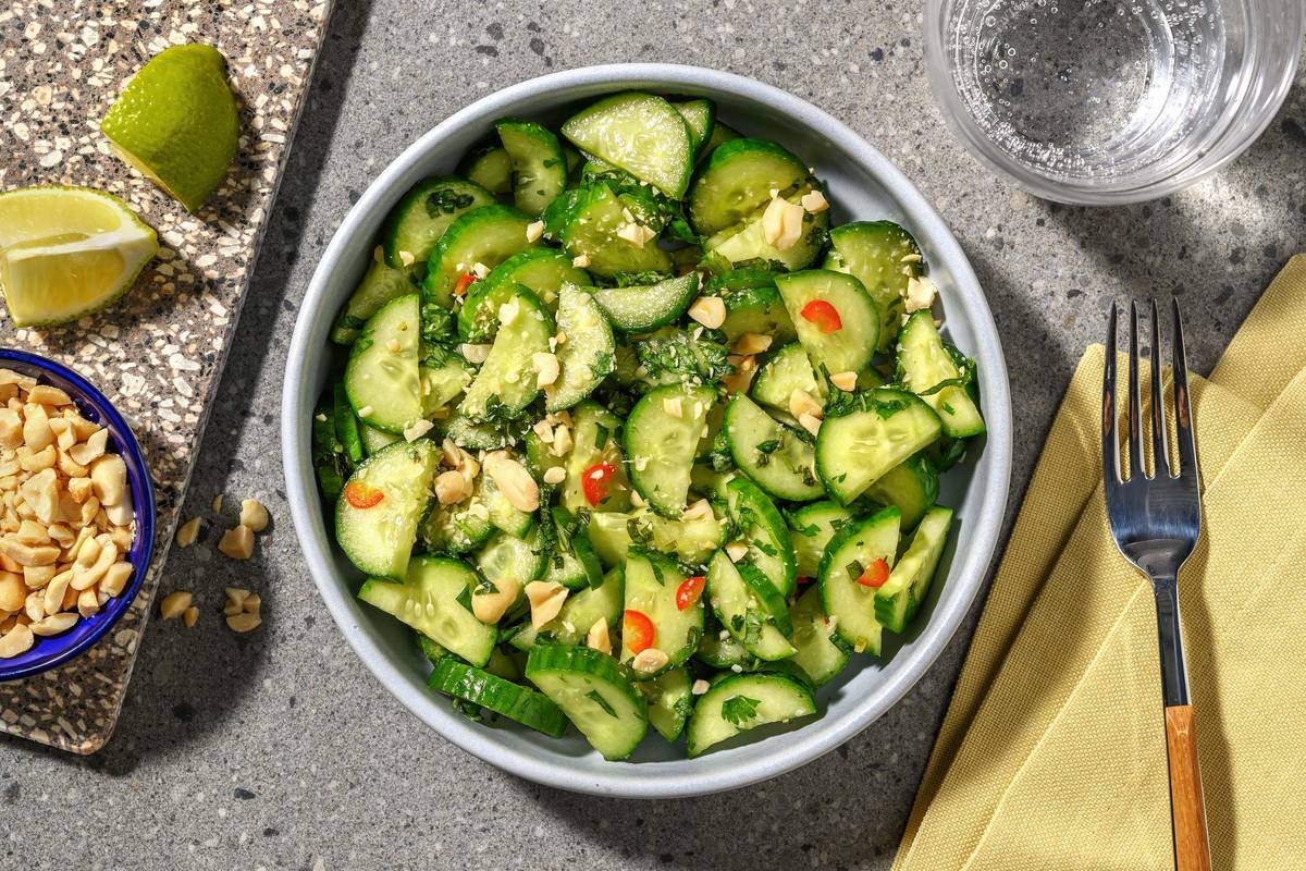 Des recettes savoureuses et super simples pour tous les moments de la journée, avec des fiches-recettes en 4 étapes et des ingrédients pré-portionnés pour 2 personnes. Cette salade d'accompagnement avec concombre, sauce de poisson, herbes fraîches et cacahuètes apporte une délicieuse touche de fraîcheur à votre repas.