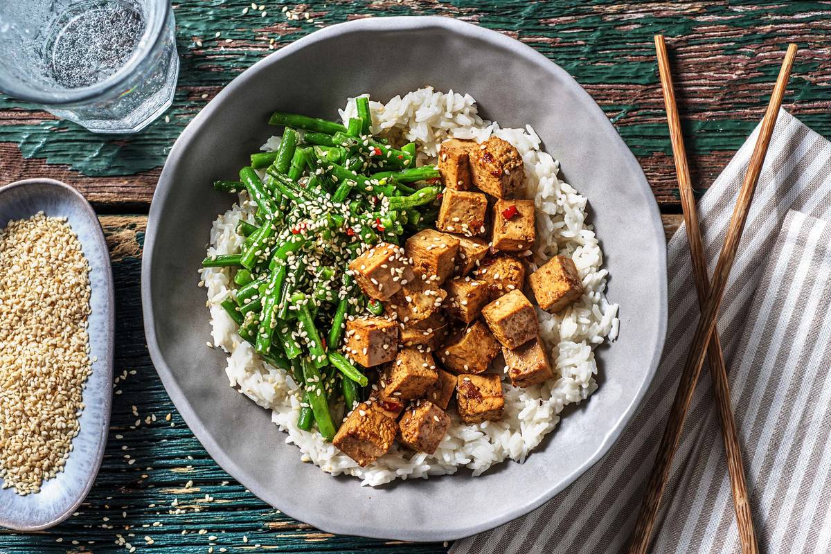 Servez le riz dans des assiettes creuses. Disposez les haricots à côté et garnissez-les avec les graines de sésame. Présentez le tofu à côté, puis versez le reste de marinade sur le tofu et les haricots.