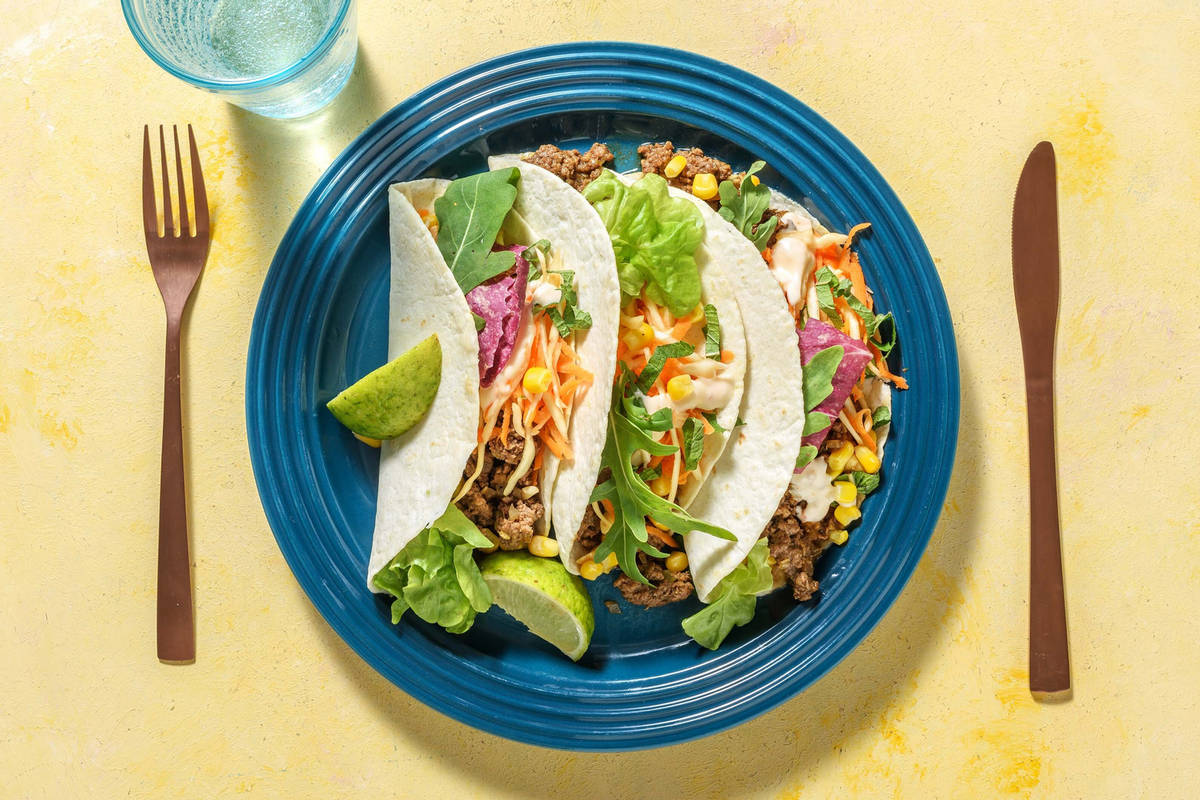 Servez le maïs, le mélange de salades, le chou blanc et les carottes, les cacahuètes, la menthe, la viande et les quartiers de citron vert dans différents bols. Présentez la sauce à base de mayonnaise en accompagnement. Disposez les mini-tortillas sur les assiettes et laissez chacun composer la sienne.