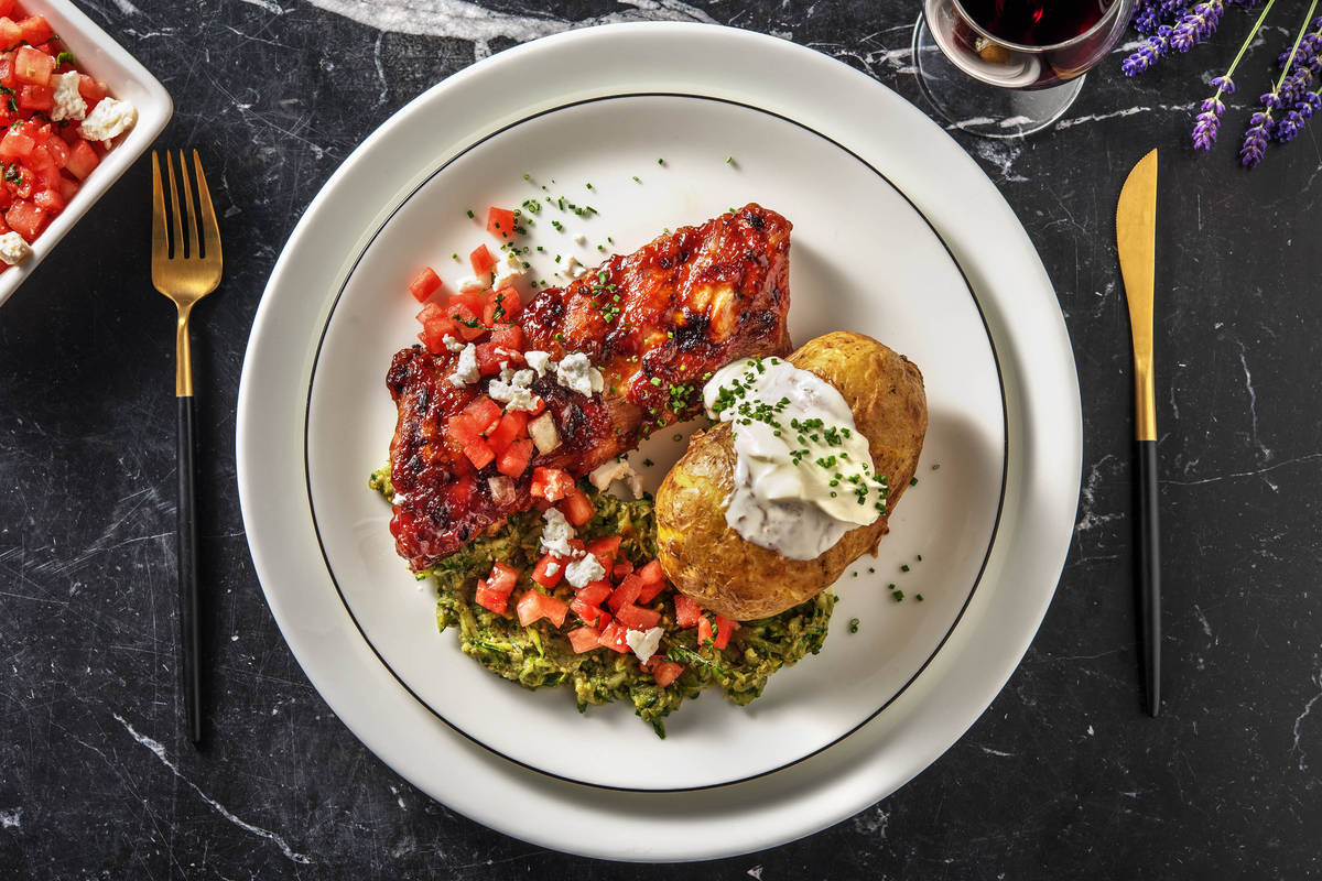 Servez les travers de porc et les pommes de terre en robe des champs. Ouvrez un peu les papillotes (attention à la vapeur brûlante !) et ajoutez la crème aigre sur les pommes de terre. Garnissez-les avec la ciboulette. Disposez la courgette à côté. Garnissez la salade de pastèque avec la feta et présentez-la en accompagnement.